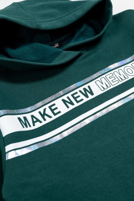 Тёплый спортивный костюм для девочки зелёного цвета с декоративной печатью на кофте. Спортивные штаны-карго на высокой посадке, сбоку декорированы накладным карманом с клапаном, пояс на резинке и затяжке.