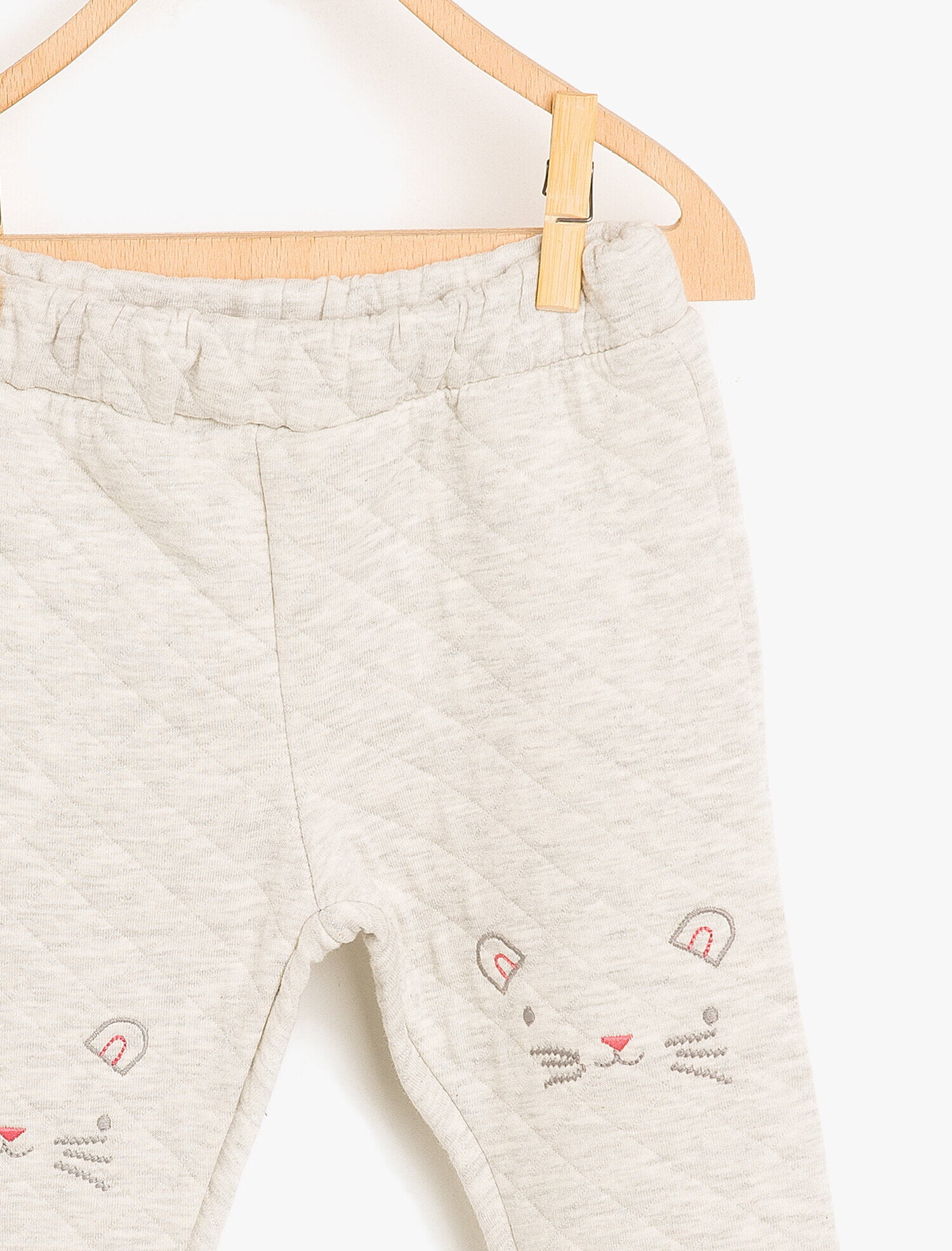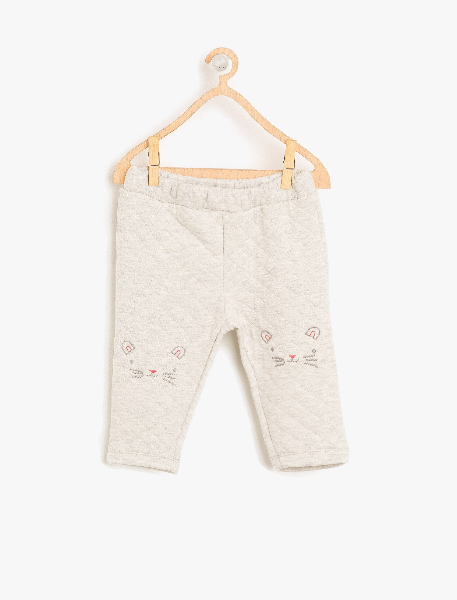 В состав входит хлопок, впереди на штанинах вышит рисунок, эластичный пояс