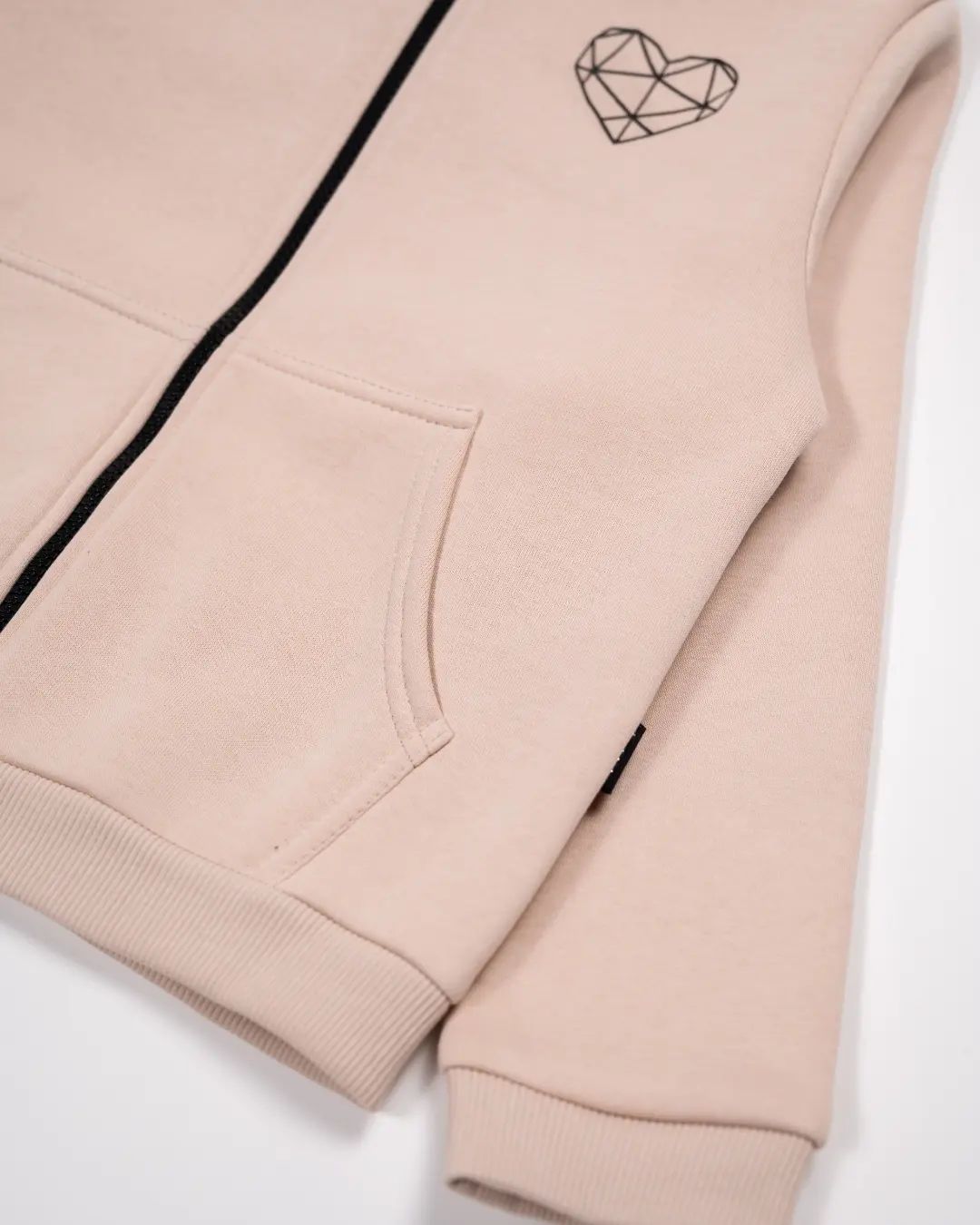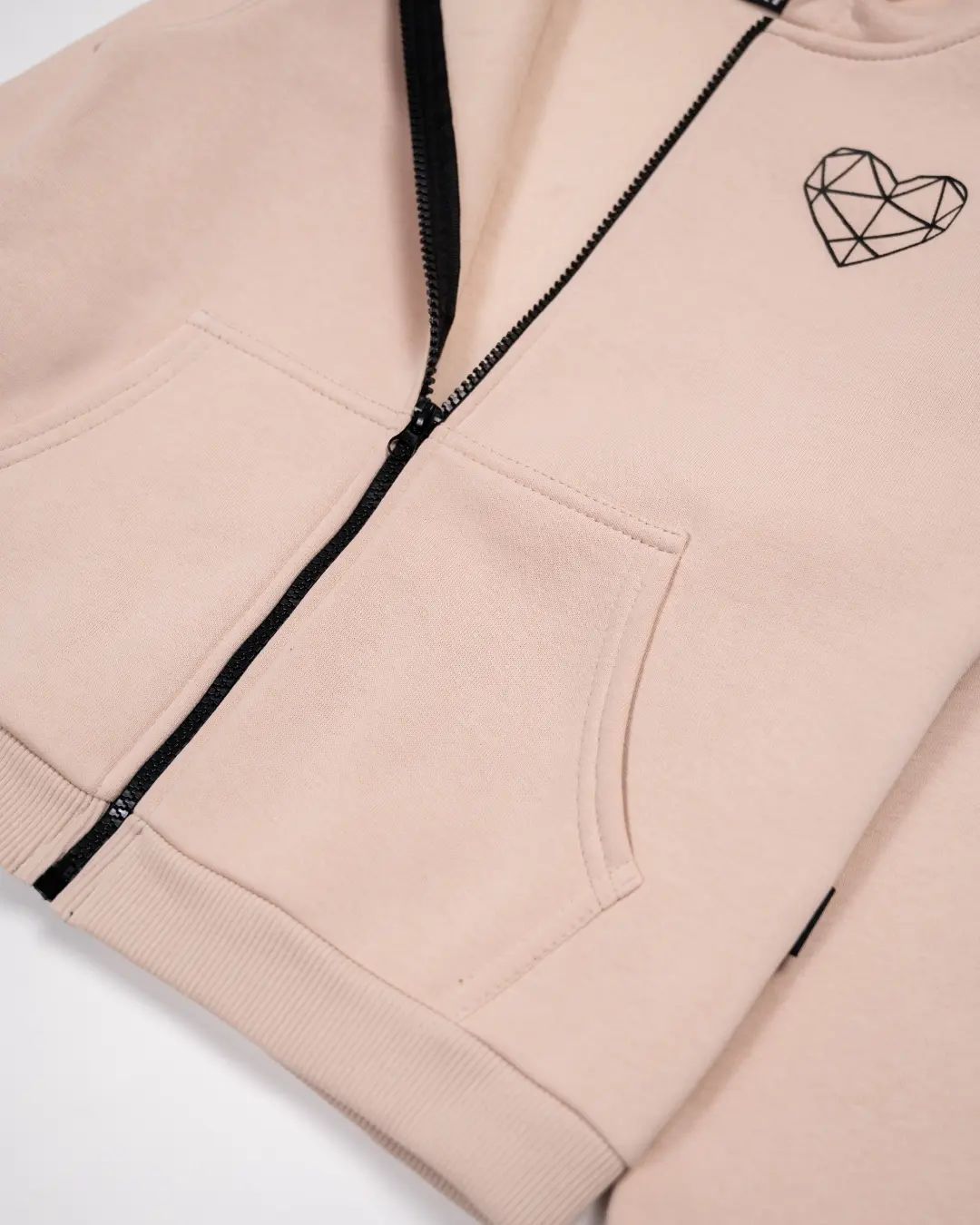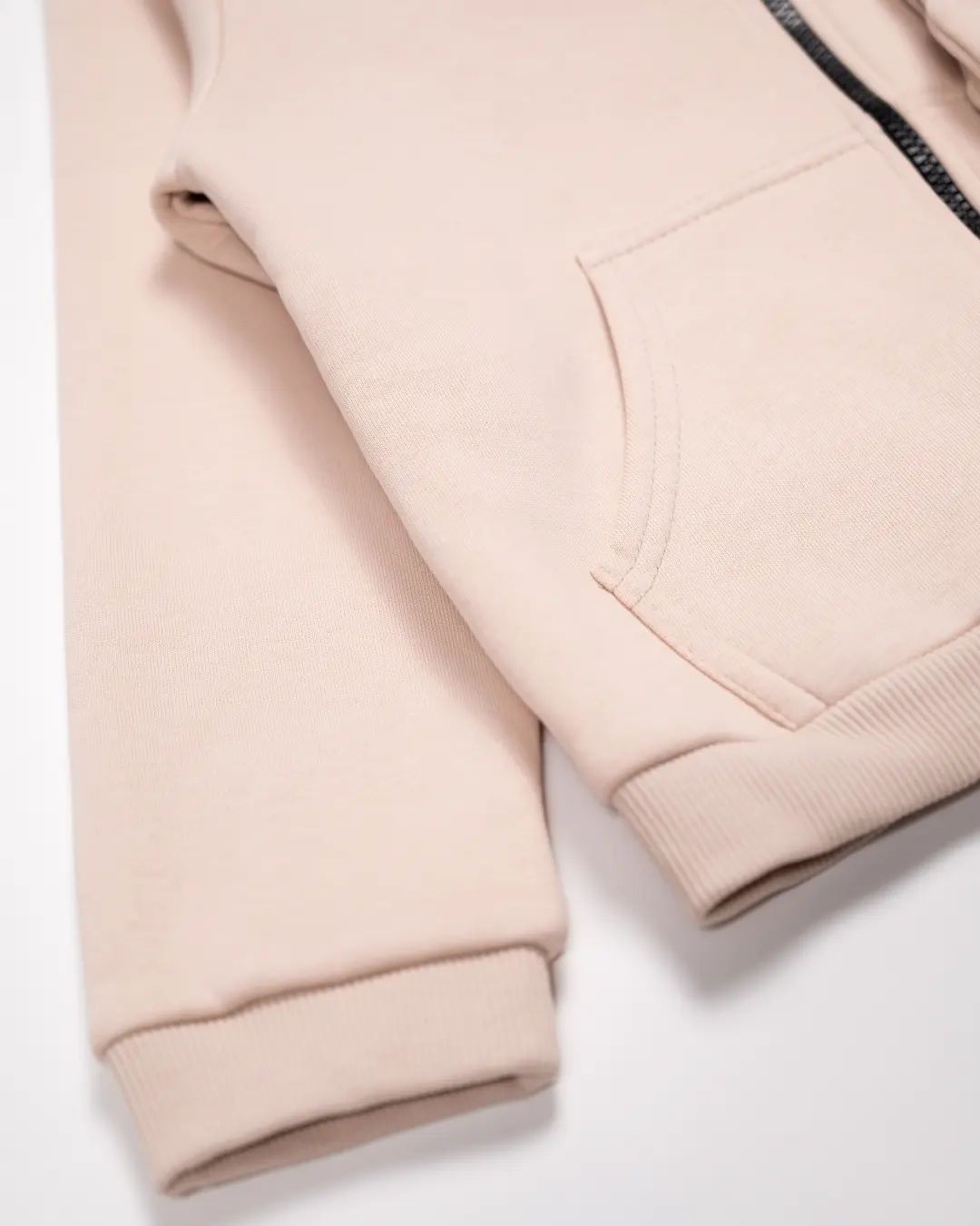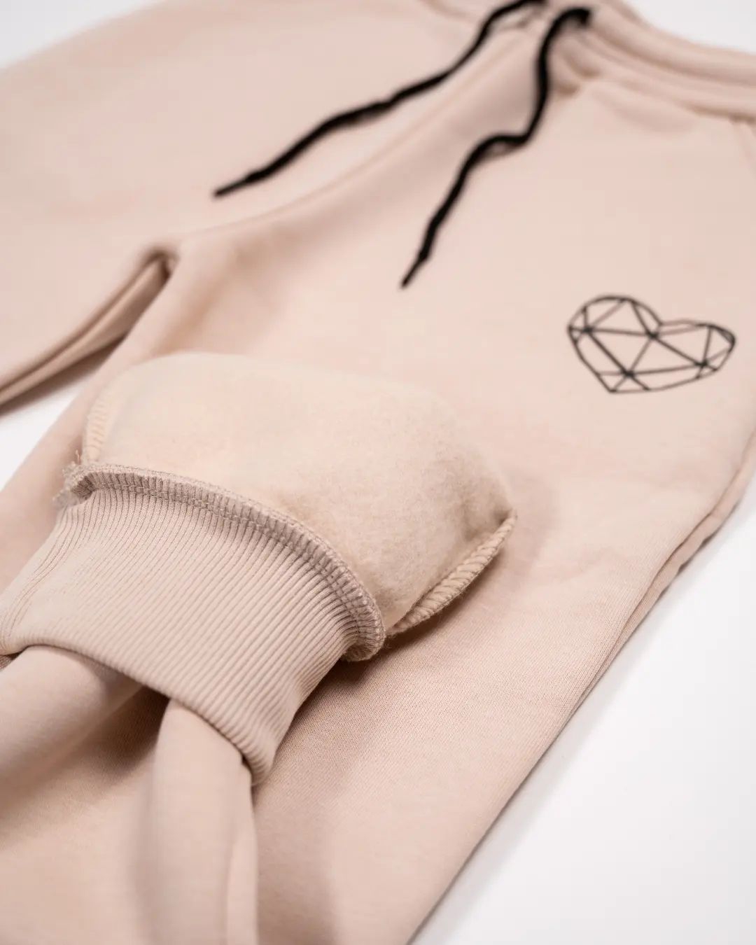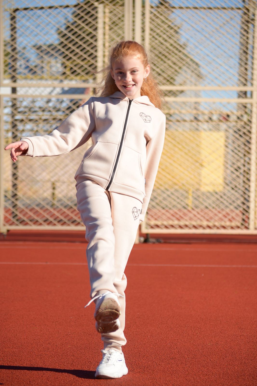 Тёплый спортивный костюм для девочки бежевого цвета с декоративной печатью на кофте и штанах.