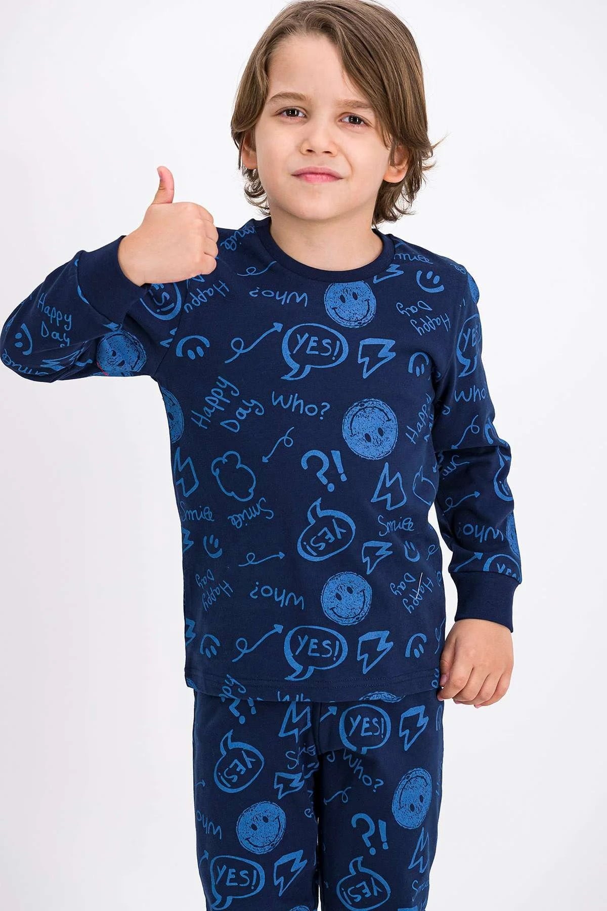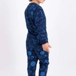 Піжама темно-синього кольору з дуже еластичного матеріалу, має чудову текстуру, облягає та розтягується, пропускає повітря. Рукави та штанини на манжетах.