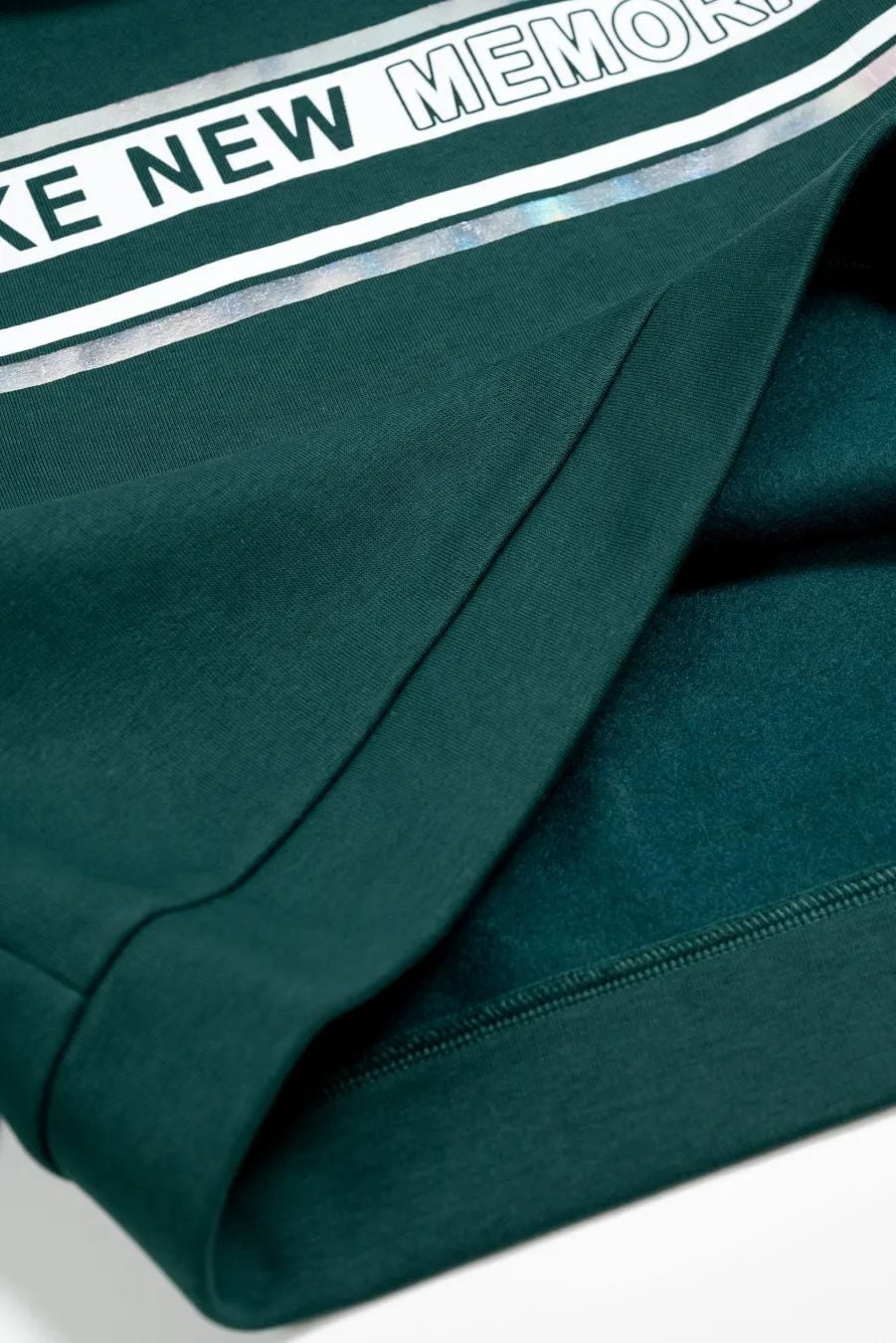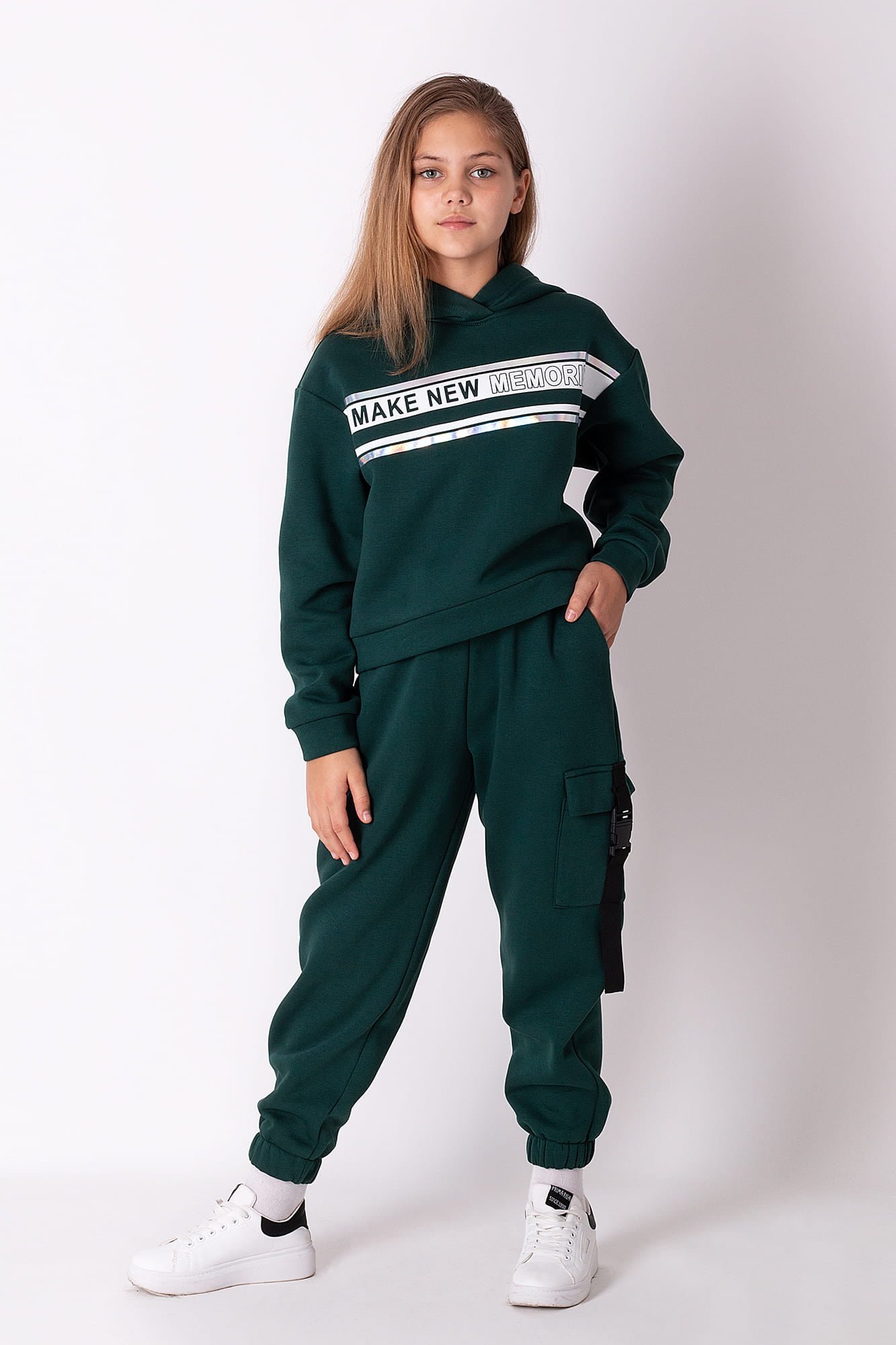 Теплий спортивний костюм для дівчинки зеленого кольору з декоративним друком на кофті. Спортивні штани-карго на високій посадці, збоку декоровані накладною кишенею з клапаном, пояс на гумці та затяжці.